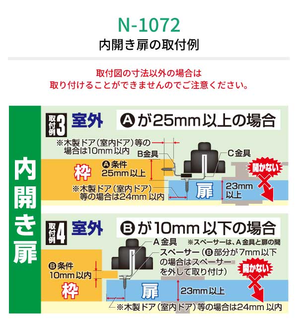 一部の「かぶせ扉(ドア側面にカバーが付いているタイプ、扉が枠の外側にかぶさるようにとりつけられているタイプ)」にも取り付け可能ですが、ドア形状や枠の形によっては取り付けできない場合があります。