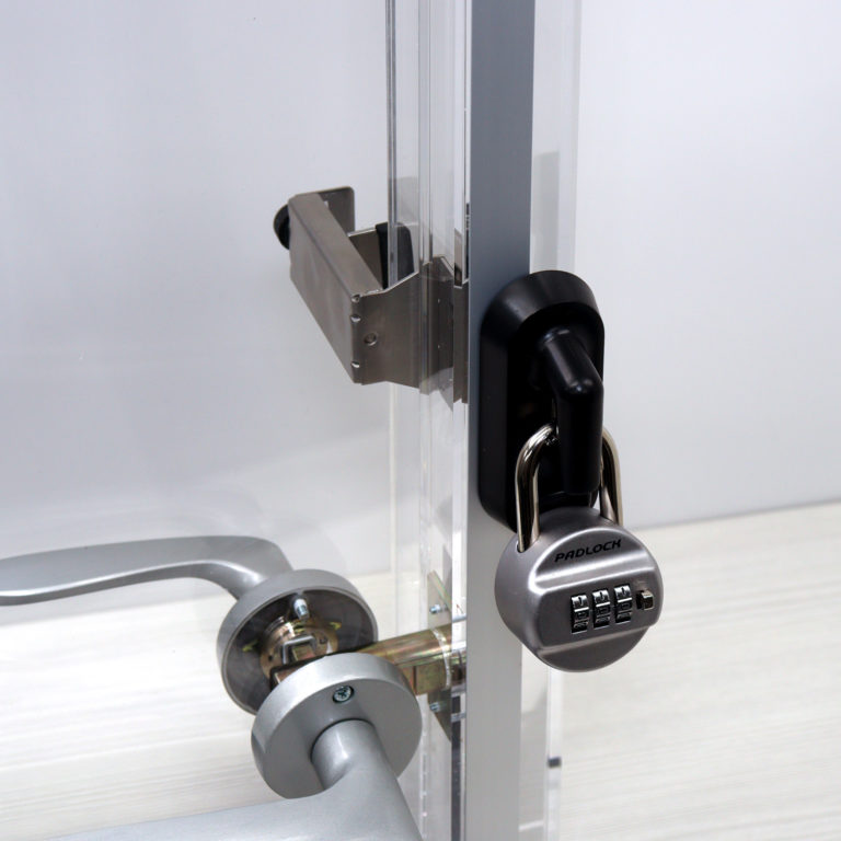 ドアにキズを付けずに後付でき、南京錠で施錠できる金具です。 推奨サイズの南京錠付です。