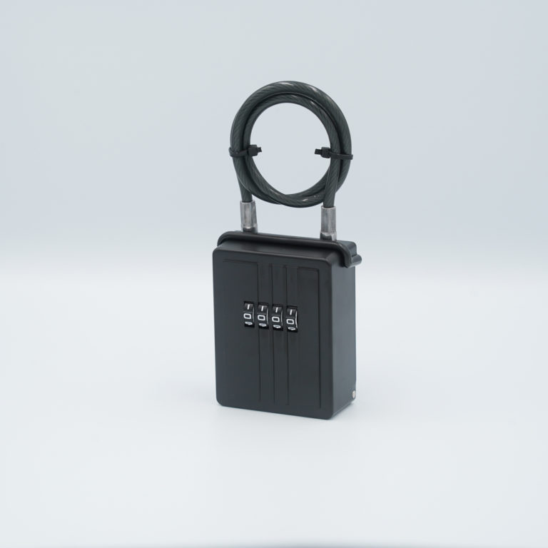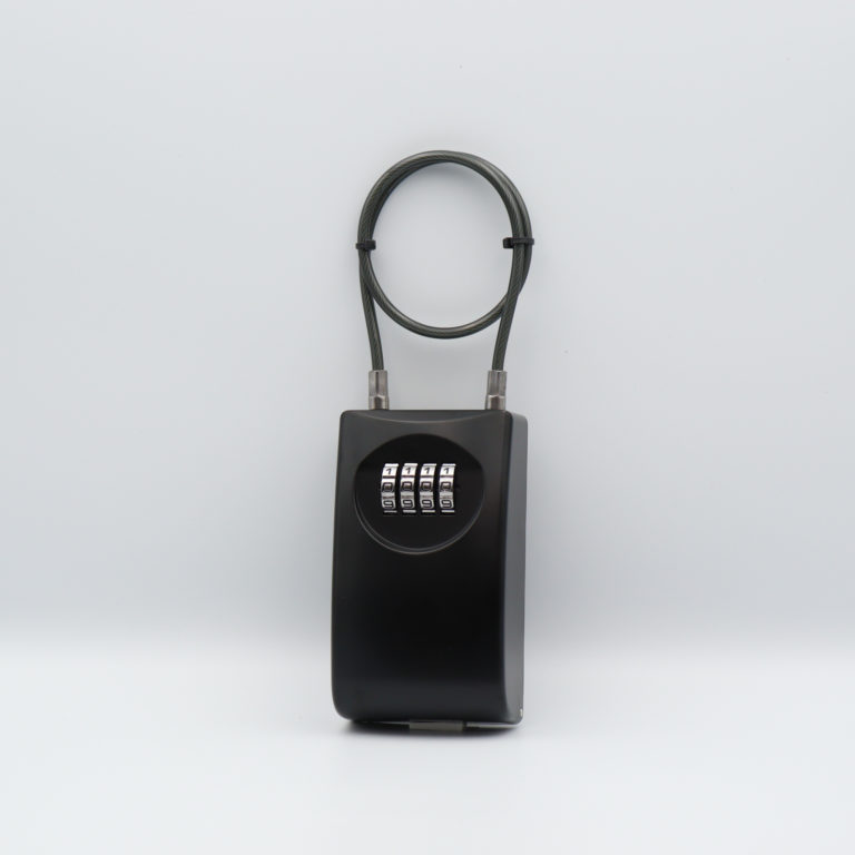 シャックル(ツル)がワイヤーにつけかえられるキーボックス。自在に設置できます。