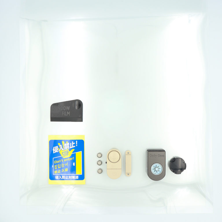 防犯フイルムと防犯錠とステッカー、防犯ブザーのセットです。